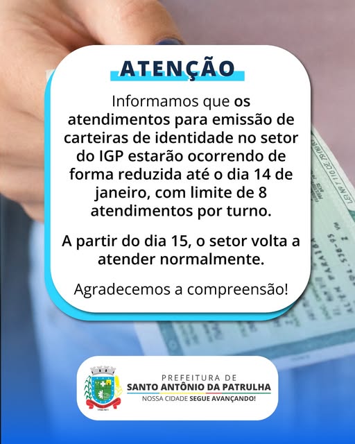 Informamos que os atendimentos para emissão de carteiras de identidade no setor do IGP estarão ocorrendo de forma reduzida até o dia 14 de janeiro, com limite de 8 atendimentos por turno.