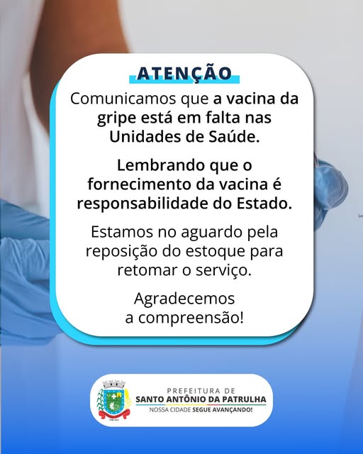 Informamos que, no momento, a vacina contra a gripe está em falta nas Unidades de Saúde do município.