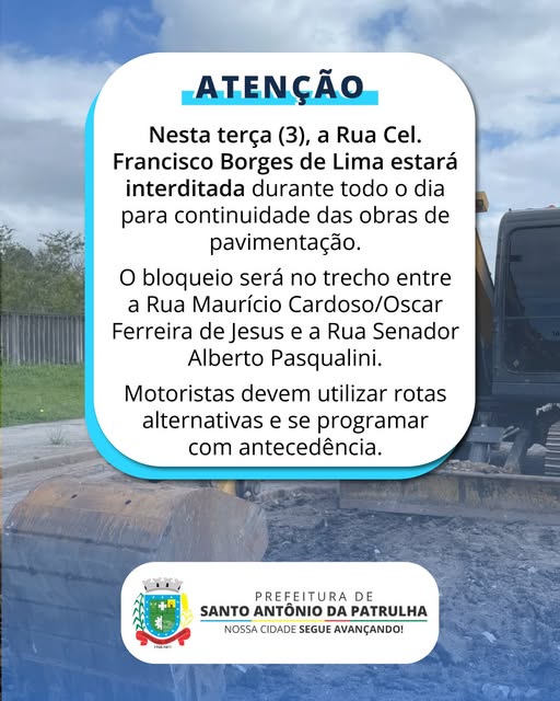 Para dar continuidade às obras de pavimentação no local, o trânsito na Rua Cel. Francisco Borges de Lima estará interrompido nesta terça (3), durante todo o dia.