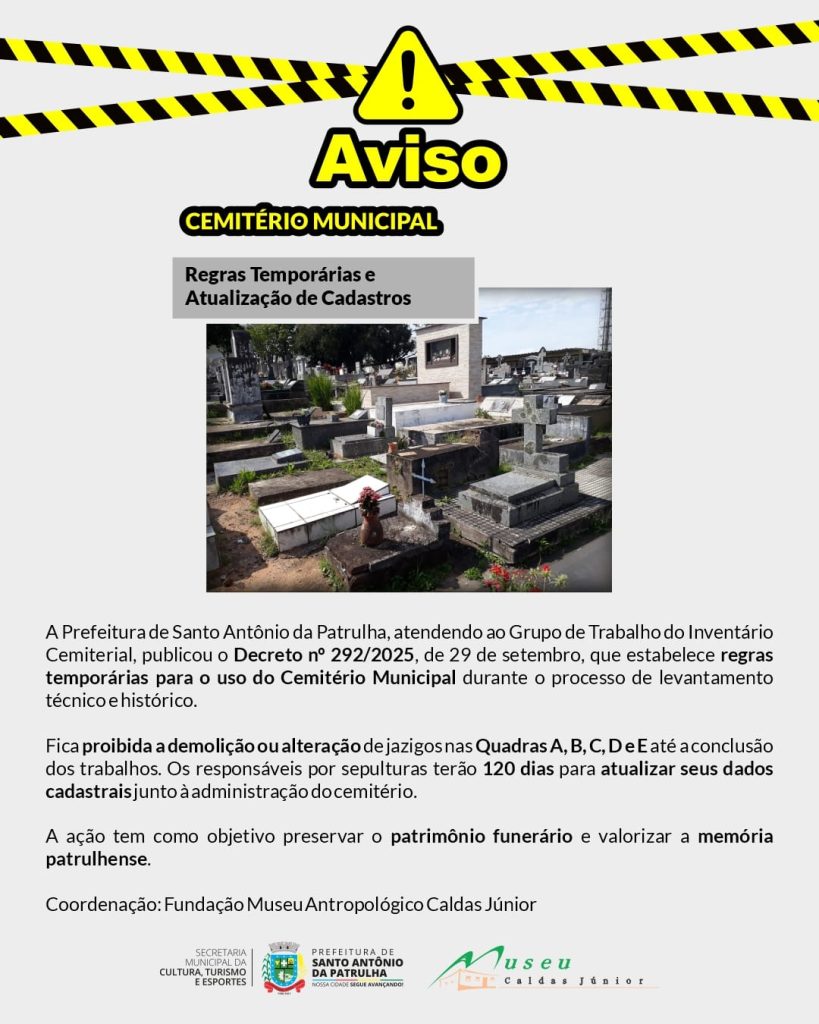 A Prefeitura de Santo Antônio da Patrulha, atendendo ao Grupo de Trabalho do Inventário Cemiterial, publicou o Decreto nº 292/2025, que estabelece regras temporárias para o uso do Cemitério Municipal durante o processo de inventário técnico e histórico que está sendo realizado no local.