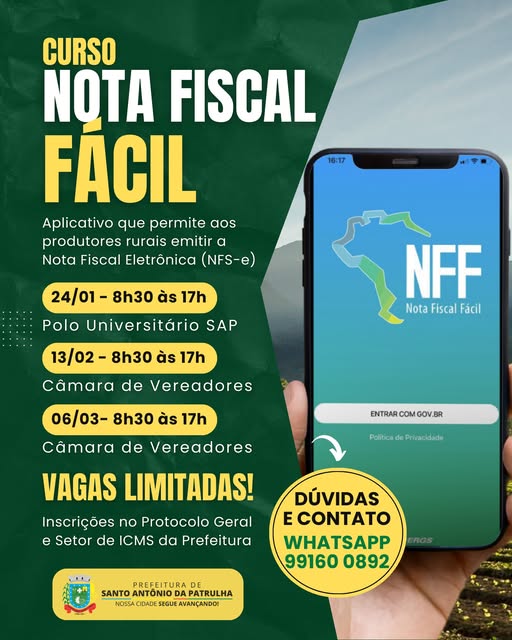 Para facilitar essa transição ao meio digital, a Prefeitura de Santo Antônio da Patrulha oferece o Curso Nota Fiscal Fácil. Em apenas um dia de capacitação, você aprenderá a utilizar o NFF de forma prática e descomplicada, com orientação da contadora e palestrante Darlene Zardin, especialista na área.