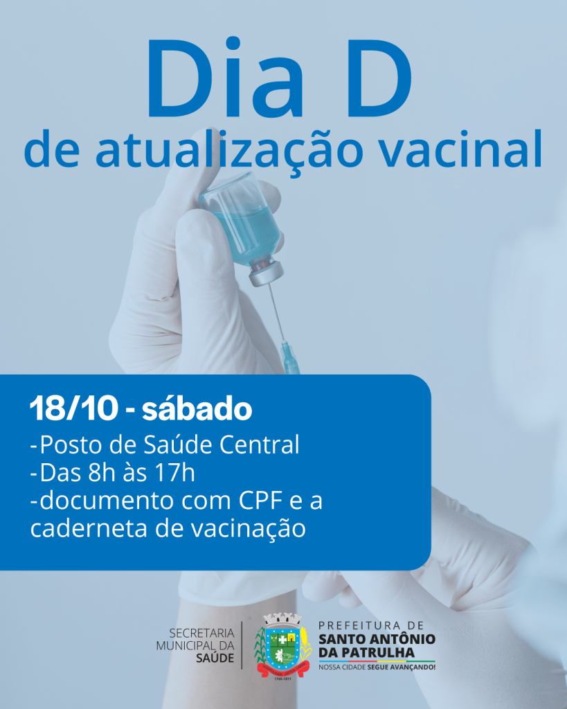 Atenção, comunidade! Neste sábado, 18 de outubro, acontece o Dia D da Atualização Vacinal. Se você ou alguém da sua família está com alguma vacina atrasada, essa é a oportunidade de colocar a caderneta em dia. Posto Central Das 8h às 17h (sem fechar ao meio-dia) Para receber a vacina, é necessário apresentar um documento […]
