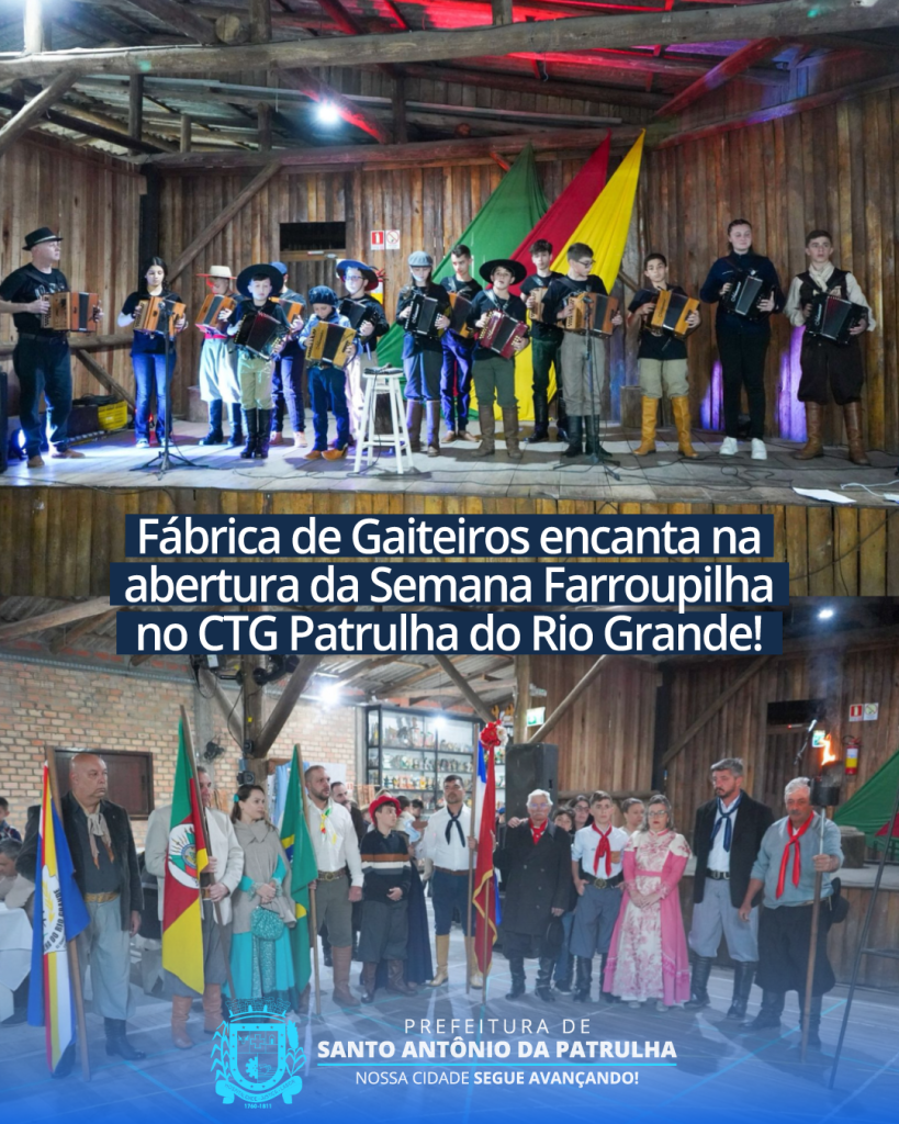 No último sábado (14), a tradição falou mais alto na abertura oficial da Semana Farroupilha no CTG Patrulha do Rio Grande! Um dos momentos mais marcantes da noite foi a apresentação dos jovens talentos da Fábrica de Gaiteiros, projeto que preserva e promove nossa cultura gaúcha por meio da gaita ponto. Com olhar atento e […]