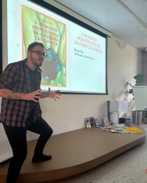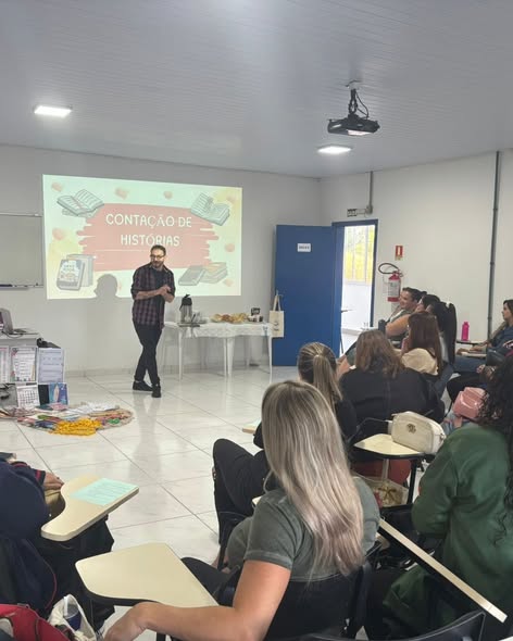 Durante o encontro, ele apresentou aos educadores a contação de histórias da obra “O Monstro Monstruoso da Caverna Cavernosa”, da autora Rosana Rios, demonstrando na prática como a leitura pode encantar e ensinar ao mesmo tempo.