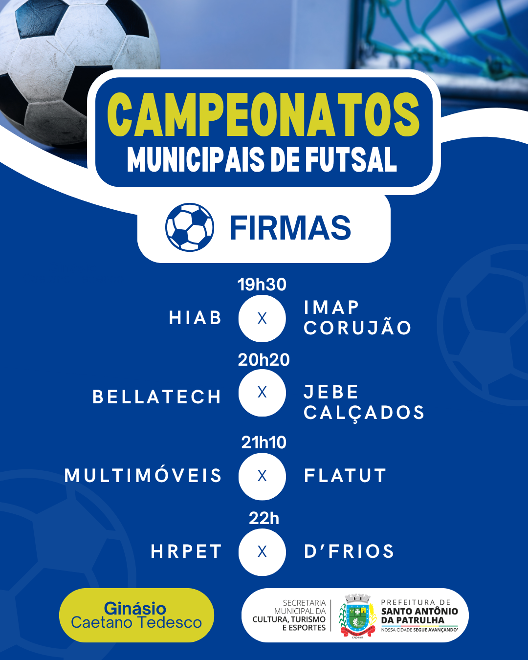 Confira os confrontos desta quinta (9) e os resultados da rodada anterior do Campeonato Municipal de Futsal – Firmas.