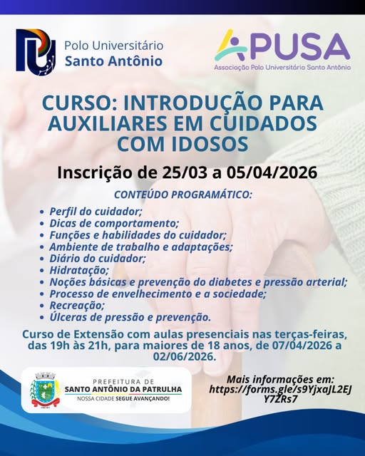 Com carga horária de 20h, o curso é uma iniciativa do Polo Universitário Santo Antônio (UAB e E-Tec) em parceria com a APUSA, e tem como objetivo preparar profissionais para atuar com cuidado, atenção e responsabilidade com a pessoa idosa.