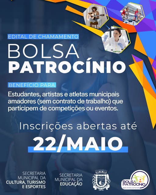A partir desta quarta (22), estarão abertas as inscrições para o Edital de Chamamento Público do Programa Bolsa Patrocínio, uma iniciativa das Secretarias Municipais da Cultura, Turismo e Esportes (SECTE) e da Educação (SEMED) para impulsionar nossos talentos locais! 🌟