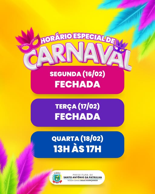 Em razão do feriadão de Carnaval, a Prefeitura não terá expediente nas próximas segunda (16) e terça (17), bem como na manhã de quarta (18).