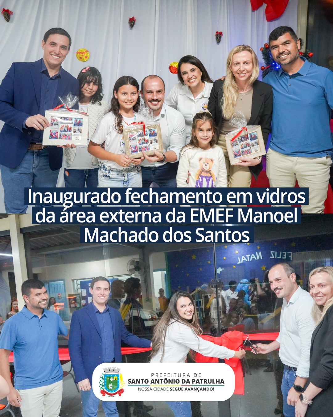 Alunos, professores, famílias e autoridades participaram da inauguração do fechamento em vidros da área externa da Escola Municipal de Ensino Fundamental Manoel Machado dos Santos, uma obra necessária e um sonho antigo de todos que vivem o dia a dia da escola.