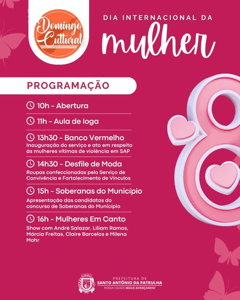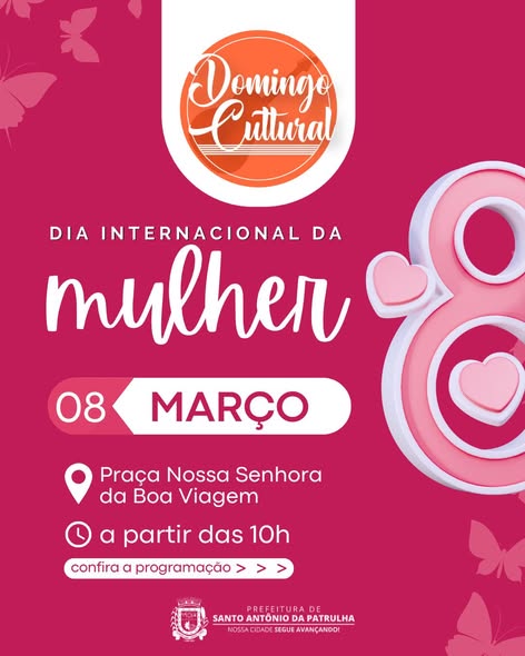 Em comemoração ao Dia Internacional da Mulher, preparamos uma programação cheia de significado, cuidado e celebração, a partir das 10h, para valorizar e fortalecer as mulheres patrulhenses.