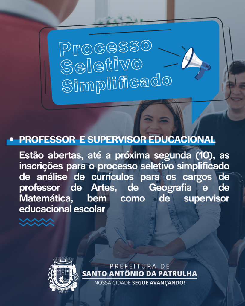 Estão abertas, até a próxima segunda (10), as inscrições para o Processo Seletivo Simplificado destinado aos cargos de professor de Artes, de Geografia e de Matemática, bem como o de supervisor educacional escolar.