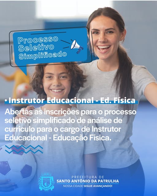 Estão abertas as inscrições para o processo seletivo simplificado de análise de currículos para o cargo de Instrutor Educacional – Ed. Física.