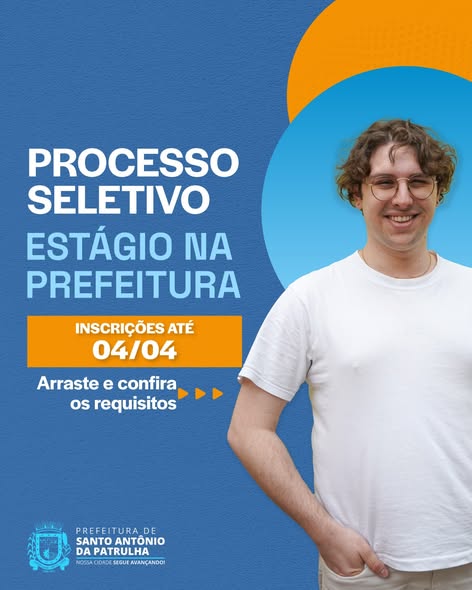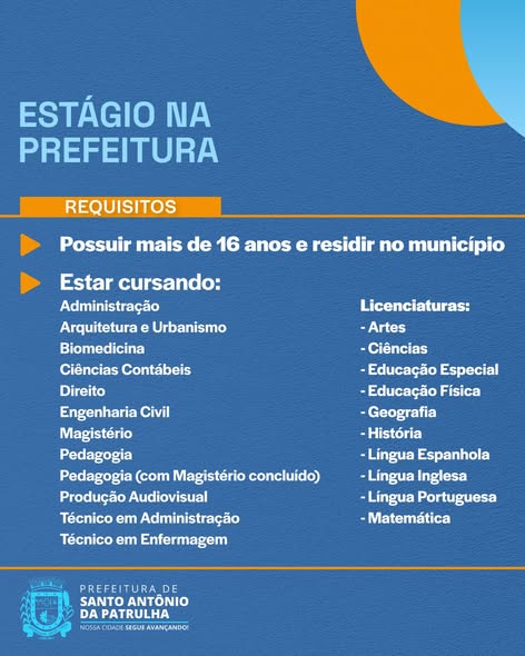 A Prefeitura está com inscrições abertas para diversas vagas de estágio, nas mais diferentes áreas — uma oportunidade para quem deseja crescer, ganhar experiência e contribuir com o desenvolvimento do nosso município.