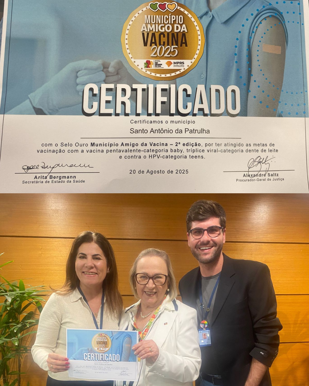 O Selo Ouro é concedido apenas aos municípios que atingem as metas nas três categorias – um marco que demonstra o compromisso de Santo Antônio da Patrulha com a saúde, a prevenção e a proteção da vida.