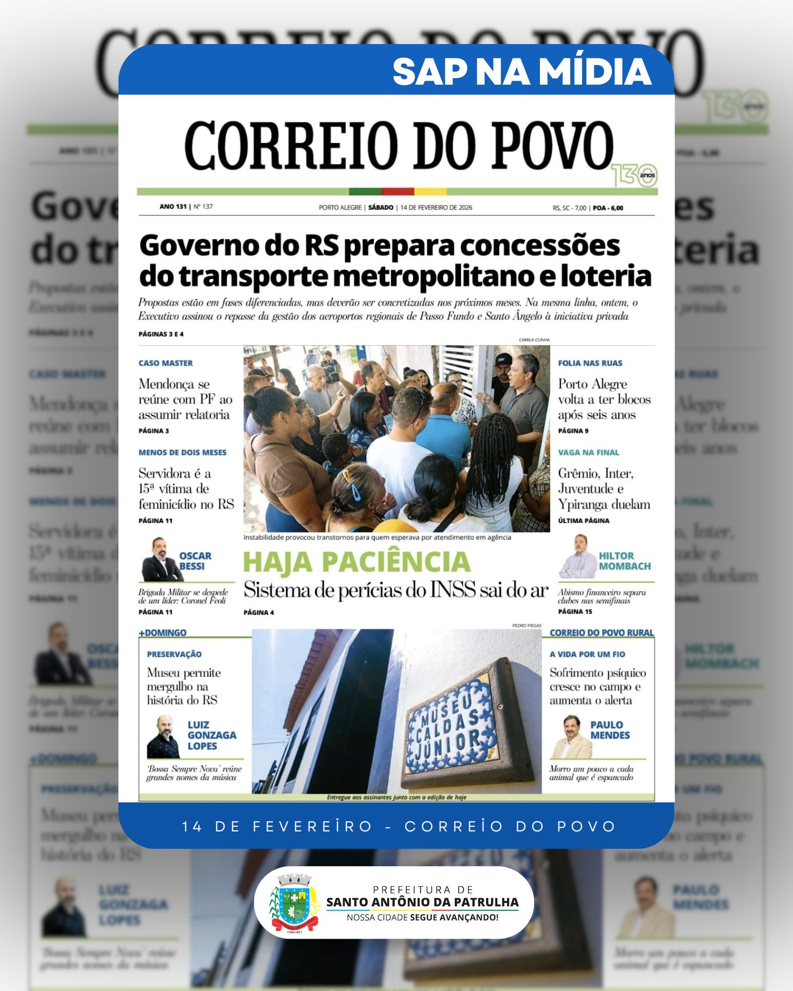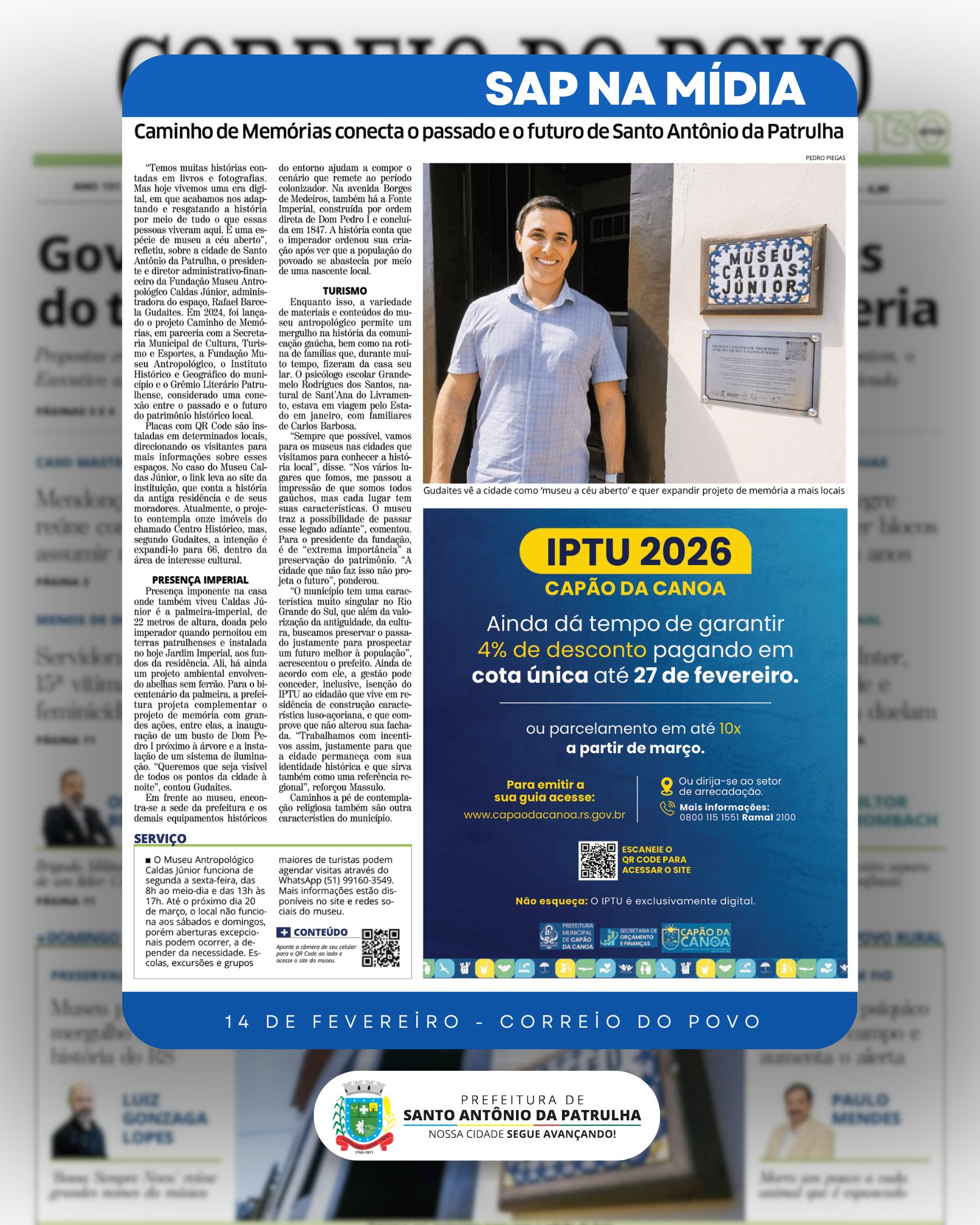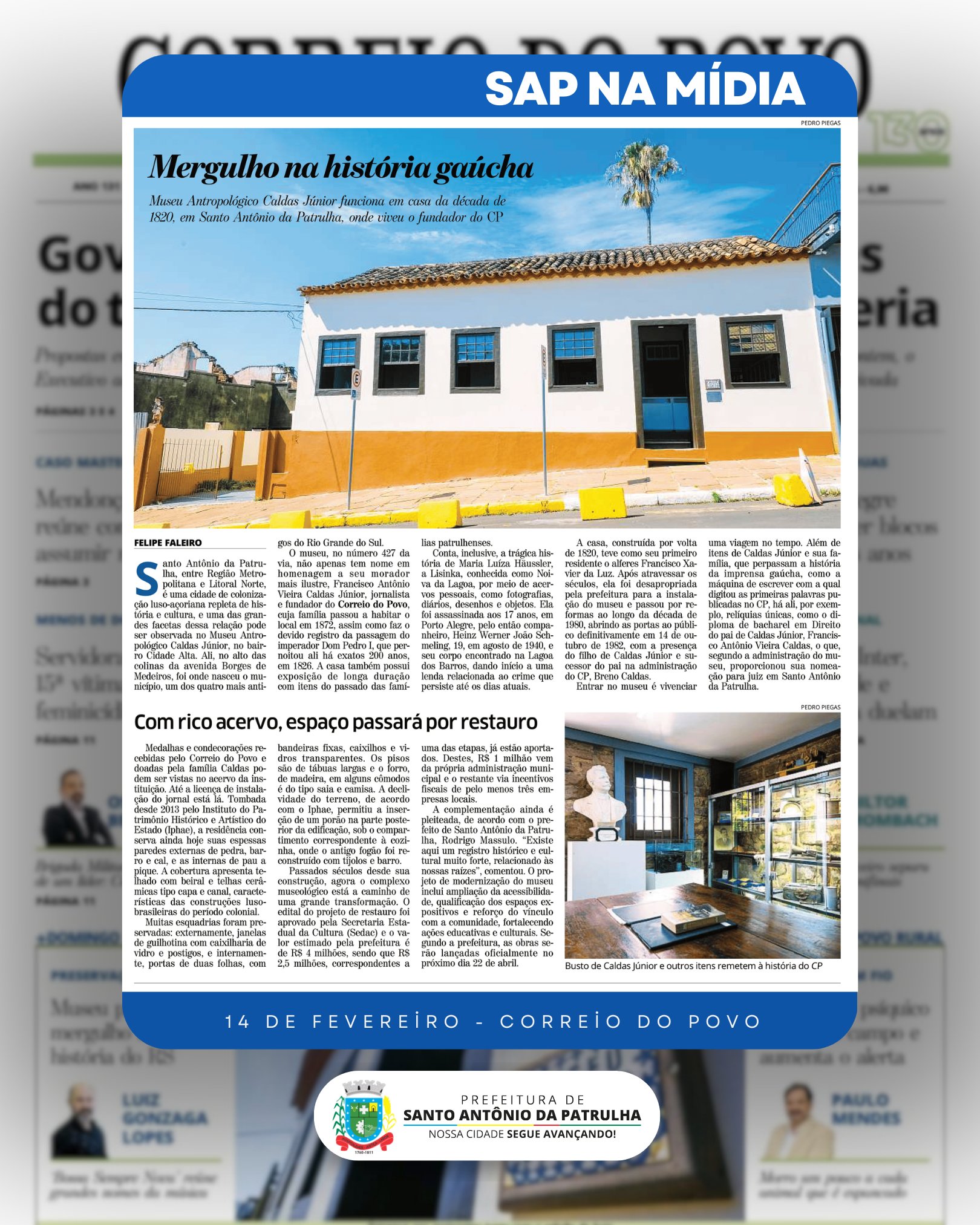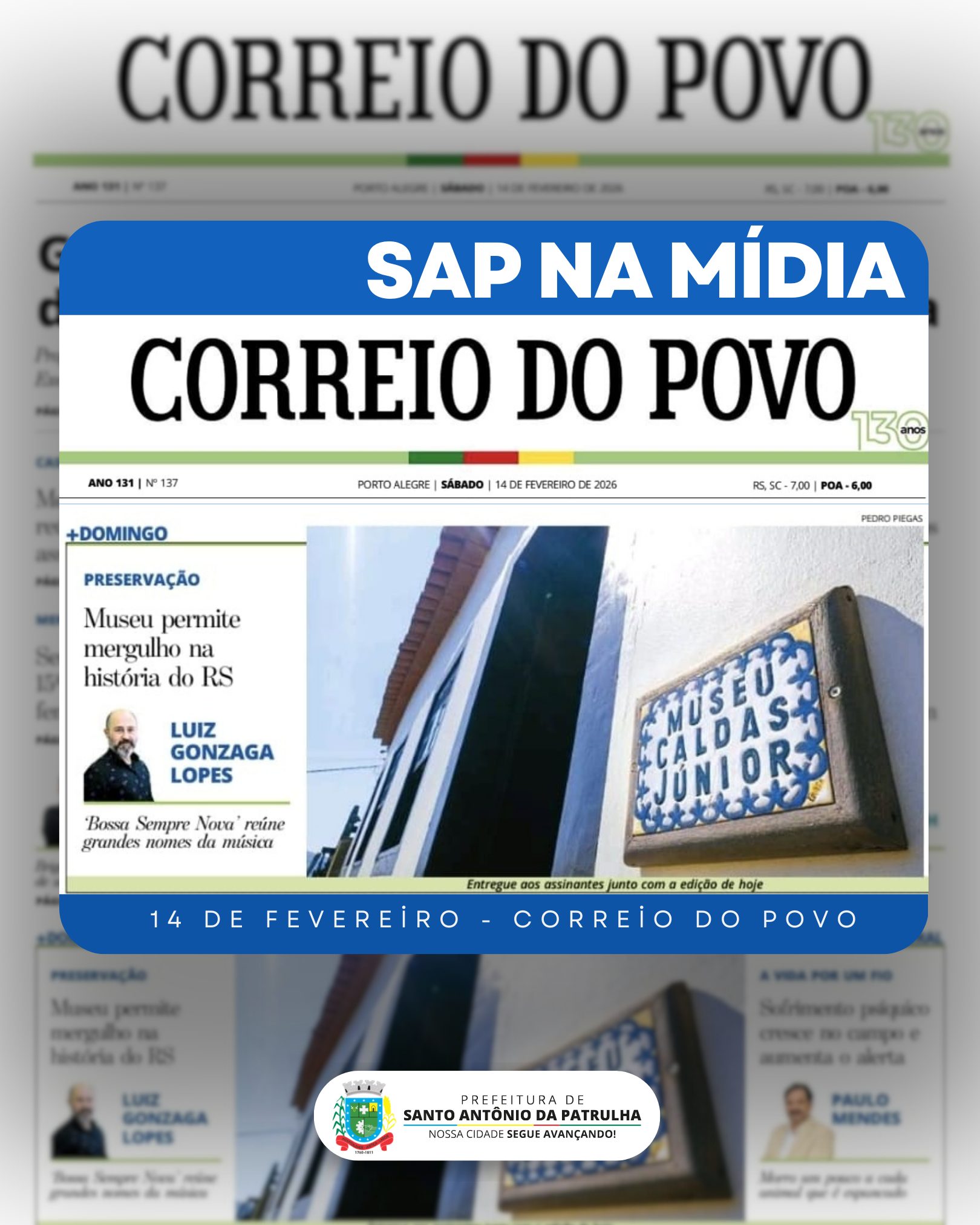 Fechando uma semana de grande destaque para Santo Antônio da Patrulha na mídia estadual, o Correio do Povo publicou uma reportagem especial de duas páginas sobre o Museu Caldas Júnior, no caderno +Domingo, valorizando a história, a cultura e o patrimônio patrulhense.