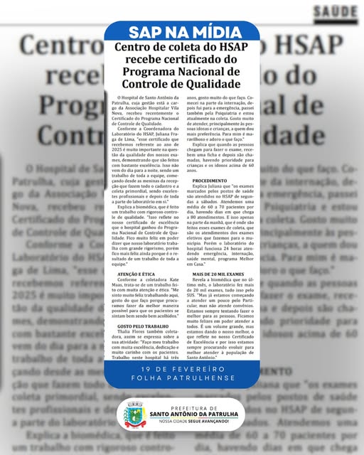 Nesta quinta (19), a Folha Patrulhense publicou matéria sobre o Hospital de Santo Antônio da Patrulha, destacando a certificação do laboratório pelo Programa Nacional de Controle de Qualidade.