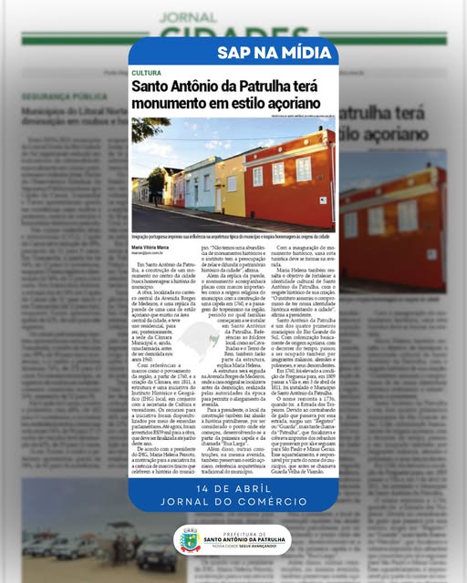 Nosso município voltou a ganhar destaque na imprensa estadual. Desta vez, o Jornal do Comércio desta terça (14) publicou matéria sobre a construção do novo Monumento à História de Santo Antônio da Patrulha, inspirado na arquitetura açoriana, uma das marcas da nossa identidade cultural. valorizando as origens e a formação do nosso povo.